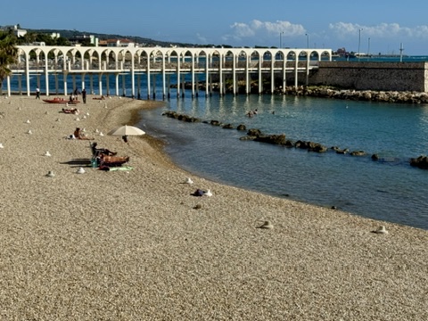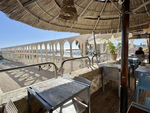The owner of the apartment where I was staying offered a shuttle service to the cruise terminal. She picked me up at the scheduled checkout time for the room – 10am. Even though I was not scheduled to check in for my cruise until 11:30, she indicated there would be no issue for me arriving earlier. She was right. I completed boarding formalities and grabbed a quick lunch all before 12:30pm. Our ship departed at 5:30pm, so I had plenty of time to get off the ship and enjoy a few extra hours exploring Civitavecchia. It was a random walk exploring parts of the town I had not been to yesterday. There was one place I did seek out. It was a nice cafe along the waterfront with a stunning view of Pirgo Beach and its beautiful pier.