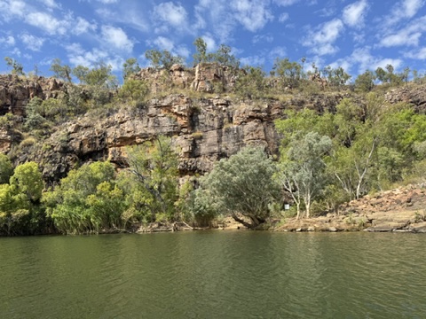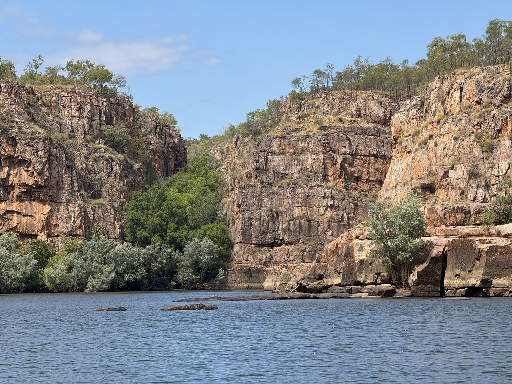 My memories of Katherine Gorge was that it was a high canyon that overlooked the Katherine River. When I arrived last night I could not find any evidence of trials that would take me into the gorge. On doing some research I found out that the best, and perhaps only way to fully experience the gorge was by takiug a series of boat rides up the river. Durong the dry season the river was blcoked at various places requiring a short walk to hop into another boat. I decided to take a three gorge tour that included the best known parts of the gorge and didn’t require too much time, given i had to drive down to Daly Waters that afternoon.