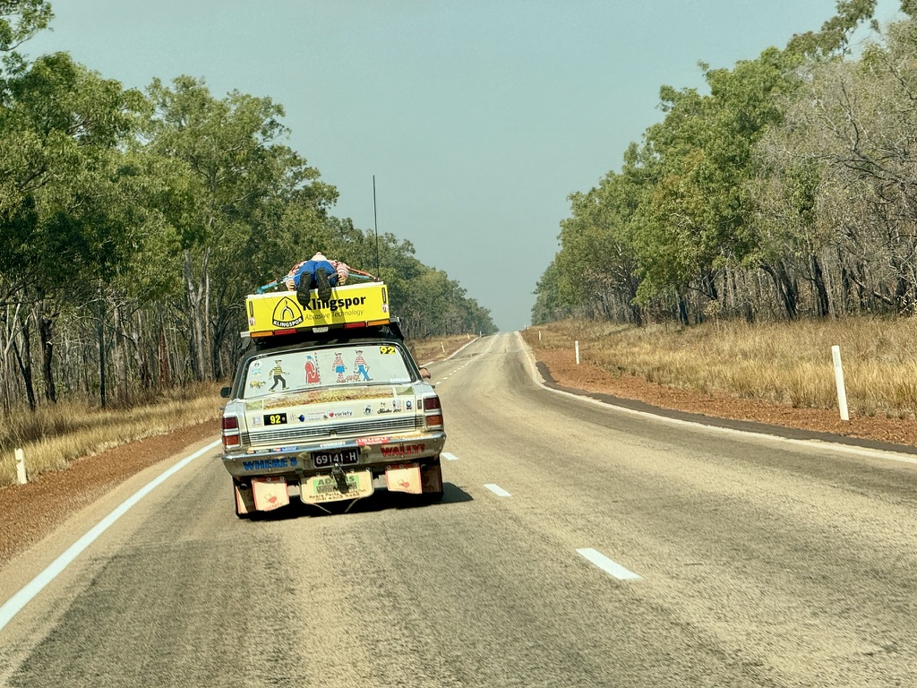 I was on the road by about 1:30PM heading south today’s today’s destination, Daly Waters. Not far out of Katherine i encountered the ‘Where’s Wally’ car for the second time heading south like me.