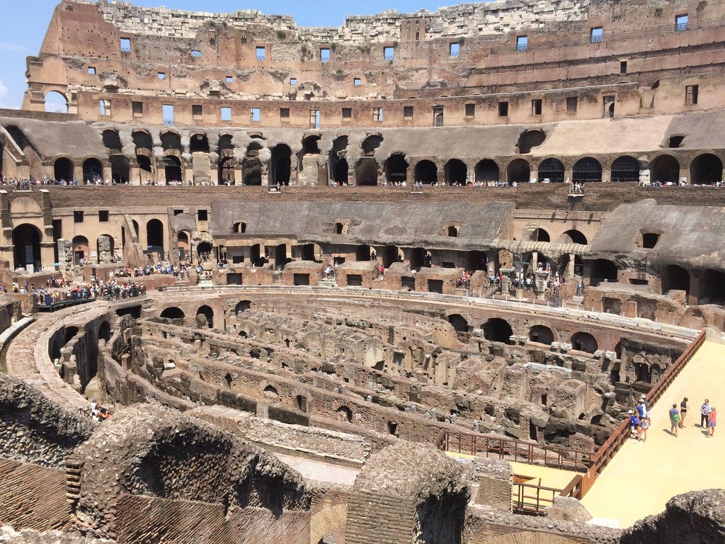 Our accommodation was right down the street from the Colosseum, so we had the chance to ‘drop by’ several times (July 21, 23, 26) to take a look and marvel at its beauty. This was often the best way for us to get Internet access using the free wifi offered by the cafes. IOn July 26, We took a tour to see the inside of the Colosseum.