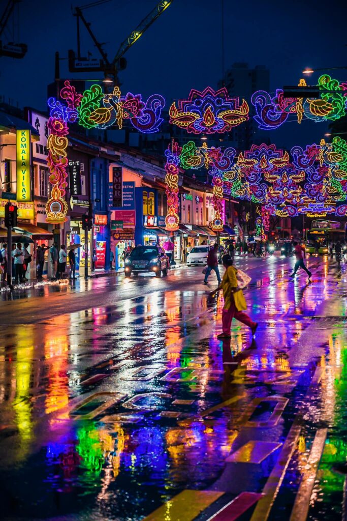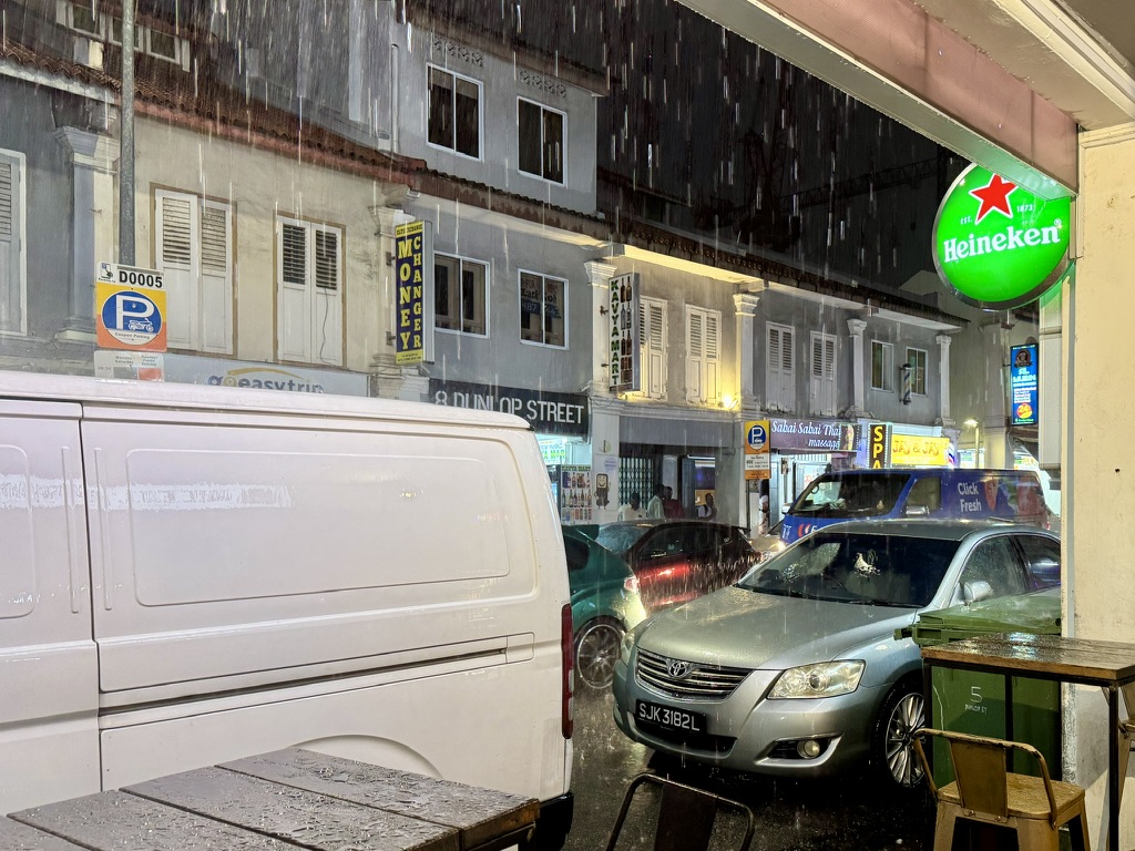 My hotel was located in the Little India area of Singapore. I made my way by train to a nearby station and then had a 1km walk to my hotel. That would have been OK, but for one thing – the weather! As I started my walk it started to rain. And not just a little rain, but a LOT. It was early evening and the streets were narrow and crowded. As the rain started to teem down, I decided to seek cover. Fortunately the shops extended out onto the street and there were covered walkways in front of many shops. The weather app on my phone suggested there was little no chance of rain at this time. This unexpected interruption gave me a chance to observe my new surroundings and the people who had gathered in this area of town. As you might expect, a lot of them were Indian! After a wait of about an hour, I was getting anxious about the delay. I had no local currency, so I didn’t want to risk a txi. I decided to pull my raincoat out of my suitcase and walk the remaining 500 metres to my hotel.