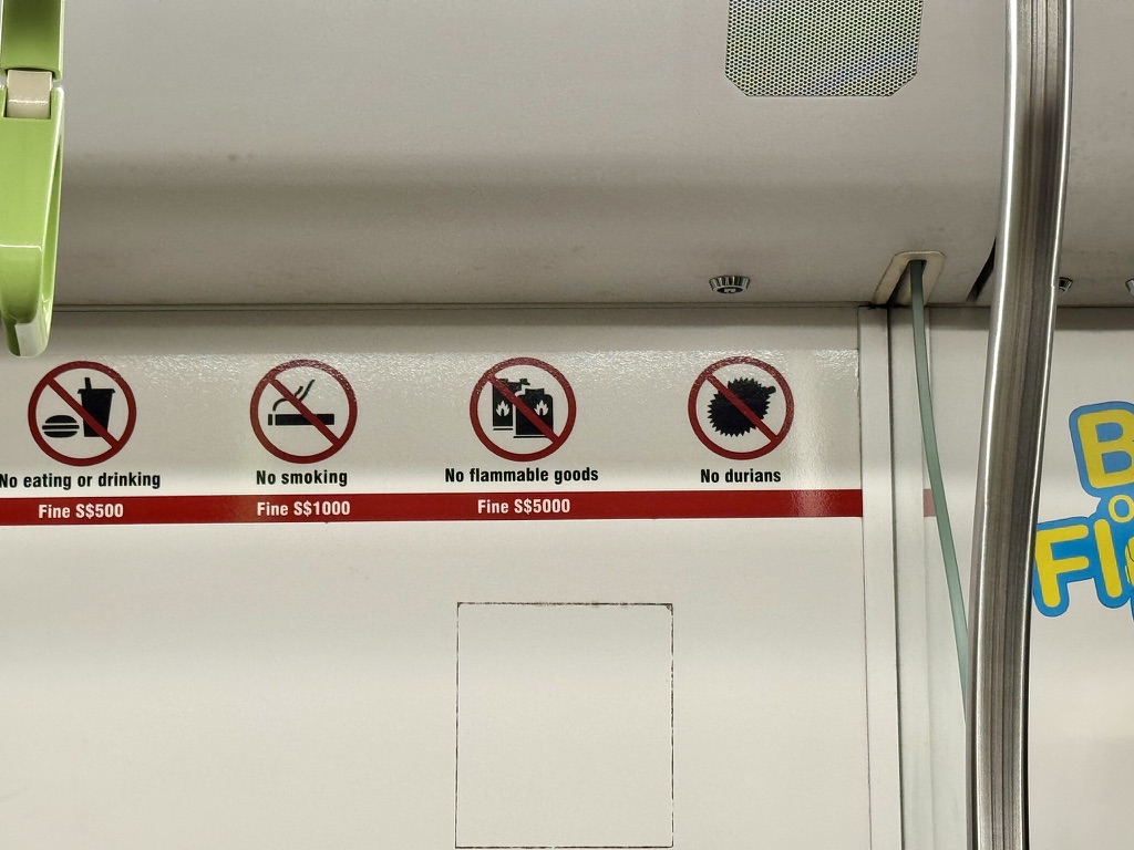 For anyone that doesn’t recognize these, the fruit above are called Durians. Known as the ‘king of fruits’, they are native to South East Asia. They are famous for their strong, distinctive odor, which is described as a mix of onion, cheese, and gym socks. My curiosity about these fruits were peaked when I noticed the sign above travelling on the trains in Singapore. It seemed odd to call out one fruit to ban on public transport.